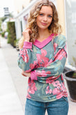 Beautiful You Vintage Teal Floral Print V Neck Hacci Knit Sweater
