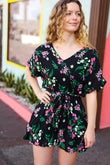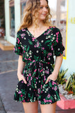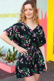 Black & Floral Surplice Short Sleeve Pocketed Romper