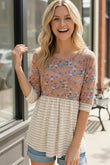 This floral babydoll top is made for everyday comfort with a touch of sweetness. Featuring a soft peach toned floral bodice paired with a lightweight striped lower panel, it creates a flattering, flowy silhouette. The relaxed fit and 3/4 sleeves make it perfect for casual outings, while the mixed prints add just enough detail to feel special. Style it with denim shorts or jeans for an effortless look that’s cute, comfy, and ready for anything.