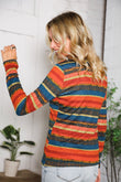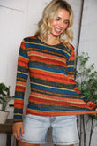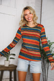 This top just feels like fall with all the pretty stripe color combos. It’s a soft stretch knit that fits close to the body. The mix of rust, teal and little golden tones really pop and give it that cozy autumn vibe. It’s lightweight so you can layer it under a jacket, cardigan or cute vest.