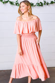 Coral off Shoulder Smocked Waist Ruffle Sleeve Midi Dress