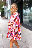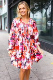 Diva Dreams Coral & Charcoal Floral Tie Neck Pintuck Satin Dress