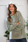 You will reach for this ultra cozy pullover daily. The textured bands on the sleeves and around the collar give it something special. The fit is relaxed but not hugely oversized.