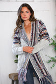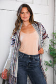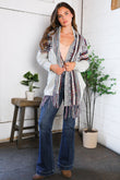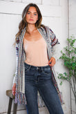 This soft cardigan is one of those pieces that just makes any outfit feel a little more special. It’s got that cozy knit body in a soft grey, and then the sleeves and trim pop with those colorful fair isle inspired patterns. The playful fringe detail on the hem is our favorite part. It’s an easy open-front fit, not bulky at all, and perfect to throw on over jeans and a tee.