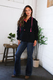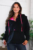 This black cotton pullover is so fun with the hot pink details popping through. The buttons and drawstrings give it just enough color to stand out. It’s lightweight but still cozy, perfect for layering on cooler days or just tossing on with jeans and sneakers. The fit is relaxed, slightly oversized with roomy sleeves and a big front pocket.