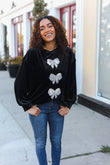 Ring in the holiday season with this oversized knit sweater featuring a stunning sequined three-bow design with a classic round neck and ribbing. Tuck in or out.