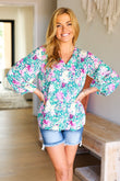 Donning a banded V neck and floral print, this woven top features flowy three quarter elastic bubble sleeves and a flattering silhouette. Wear with skinny jeans or shorts for a stunning contrast.