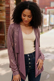 This plum suede cardigan combines elegance with so much fun! The golden and black shimmering snake skin print is just so cool. It even includes functioning side pockets.