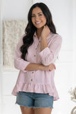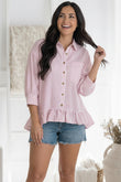 Light, breezy, and full of charm, this striped button front blouse is an easy pick for warmer weather days. Designed with soft pink pinstripes, a relaxed silhouette, and a subtle ruffle hem, it brings a touch of femininity without feeling fussy. The lightweight fabric drapes beautifully, while the cuffed sleeves and classic collar keep the look versatile. Perfect with denim shorts or jeans for a casual cute outfit you’ll reach for again and again.