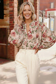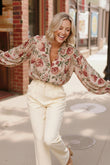 We love this stunning blouse! The smocked shoulder and wrist detail gives the top a lovely feminine fit. It has a vintage floral print that overlays a subtle stripe. It looks beautiful dressed down with denim and a cozy cardigan or up with a cute skirt and blazer.