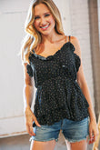 Add glam to your summer closet with this woven rayon dobby dot print ruffle hemline blouse with a stunning frill ruffle V neck with pulled Merrow stitching and elastic waist.