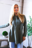 This tunic has that easy throw-on and go kinda vibe. It’s a deep olive green with thin white pinstripes running down, which makes it feel classic but still relaxed. The fit is loose and flowy. It works great with leggings. It’s got a partial button front with 3 buttons and a collar. The fabric is soft and structured, perfect for layering or just wearing on it’s own. Super comfy and an easy way to look put together.