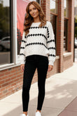 Cozy meets chic in the Snowfall Diamond Sweater! This soft ivory knit features bold black diamond stripes that bring a playful pop to your cold-weather look. With its slightly relaxed fit and plush feel, it’s the ultimate 'throw on and go' piece for everything from coffee dates to cabin weekends. Style it with jeans, leggings, or a skirt.