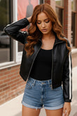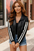 Turn every sidewalk into your runway with the Street Stride Jacket! This edgy faux leather zip-up features bold white racing stripes down the sleeves, giving it that perfect mix of sporty and chic. With a sleek fit and just the right amount of shine, it’s made for coffee runs, concert nights, and everything in between. Throw it over a tank and denim shorts for that cool-girl vibe that says effortless confidence.