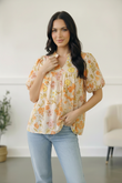 Soft, romantic, and effortlessly flattering, this puff sleeve top features a delicate floral print in warm spring hues with airy puff sleeves and a relaxed, flowy silhouette. The lightweight fabric drapes beautifully, making it perfect for everyday wear while still feeling polished and feminine. Easy to style with denim or dress up with trousers, this top is a timeless boutique staple for the season.