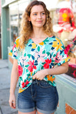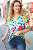 Add color to your summer closet with this bold teal and coral flat floral print top designed with banded short sleeves and a casual V neck.