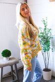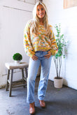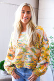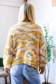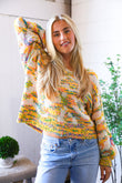 This sweater is such a standout. The texture is soft and a little nubby, with a mix of yarns that really gives it some nice dimension. The color combo of yellow, blue, pink, green and cream make it a great transitional piece.