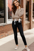 Wrap yourself in charm with this beautifully detailed cable-knit sweater. Designed with cascading braided hearts and delicate lace ties that add a touch of sweetness. The warm neutral knit pairs effortlessly with denim for an everyday look that feels cozy, cute, and completely unique. Soft, stretchy, and full of character, this sweater is your new go to for coffee dates and weekend errands.