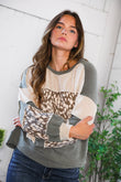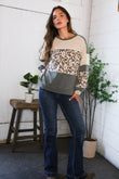 This pullover is such a good mix of comfy and stylish. It’s got that colorblock look with soft beige on top, a fun animal print across the chest and sleeves, then a washed grey at the bottom. The fabric feels lightweight but still cozy, kind of that in-between weight you can wear year round. The fit is relaxed and a little slouchy. Pairs perfectly with denim or leggings.
