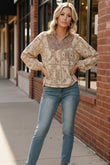 Soft, earthy, and full of vintage charm. This boho inspired blouse features a beautifully detailed mixed print, a relaxed flowy fit, and a soft neutral palette. It brings a touch of romance to every outfit. The lightweight fabric and subtle gathered sleeves add movement and comfort, making it perfect for dressing up denim or pairing with your favorite cold weather layers.